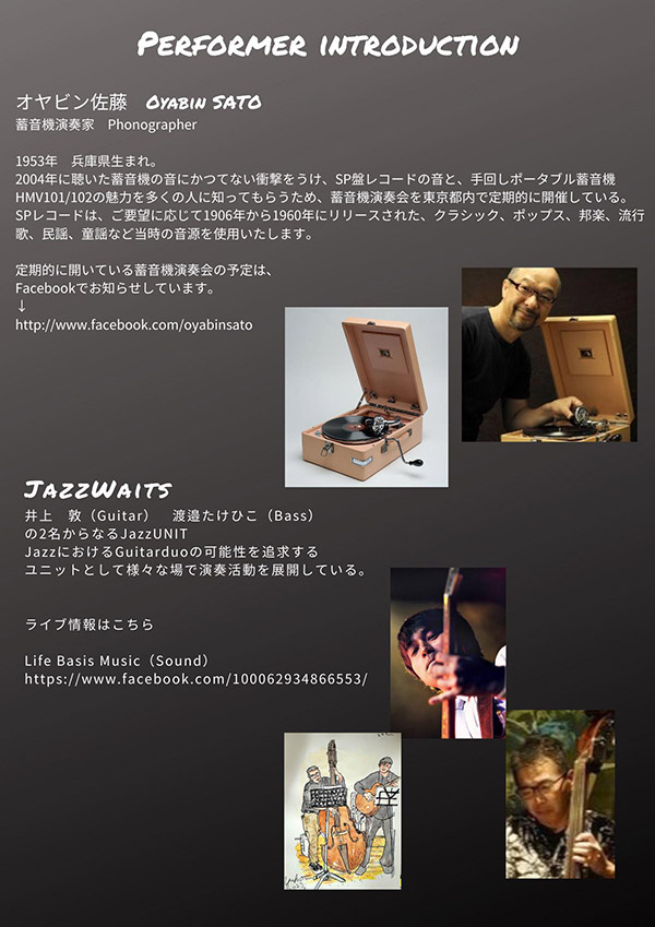 件名に日付」、「本文に氏名、連絡先、ジャンルや楽器及びスタイルなど」を明記の上、送信くださいます様、お願いいたします。 - 詳細